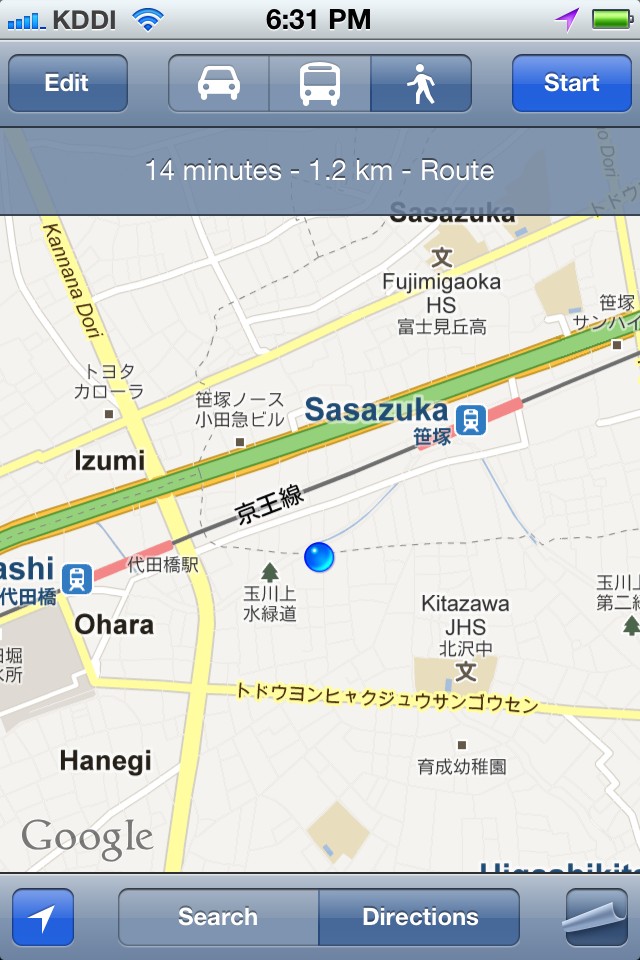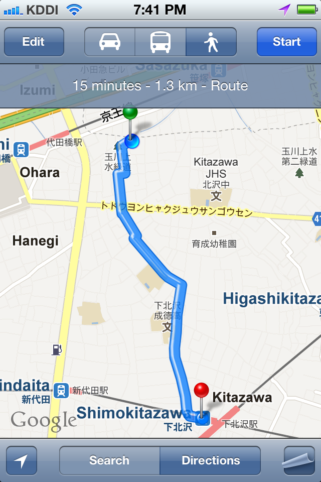 When disembarking from a train station, it takes a few minutes for the app to recalibrate. For instance, last night I emerged from Shibuya station, which is crazy busy. Everybody at Shibuya station is on their cell phone, so the signal can be disrupted pretty easily.
